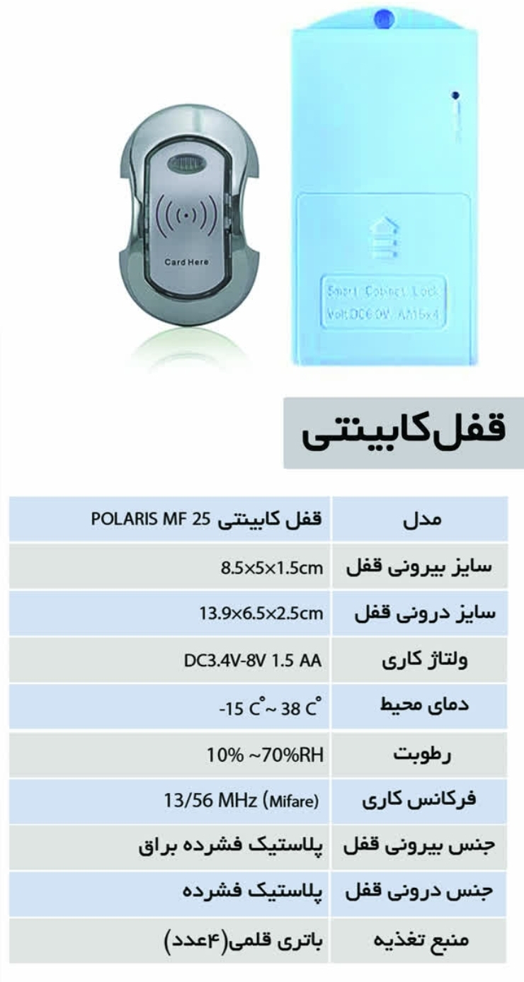 قفل POLARIS MF25 یک قفل الکترونیکی مخصوص کمد باشگاهی / استخری است که با تکنولوژی RFID در فرکانس EM125KHz کار میکند. برخلاف مدلهایی که از فرکانسهای بالاتر مانند Mifare استفاده میکنند، این مدل بیشتر در سیستمهای سادهتر و اقتصادیتر مورد استفاده قرار میگیرد.
